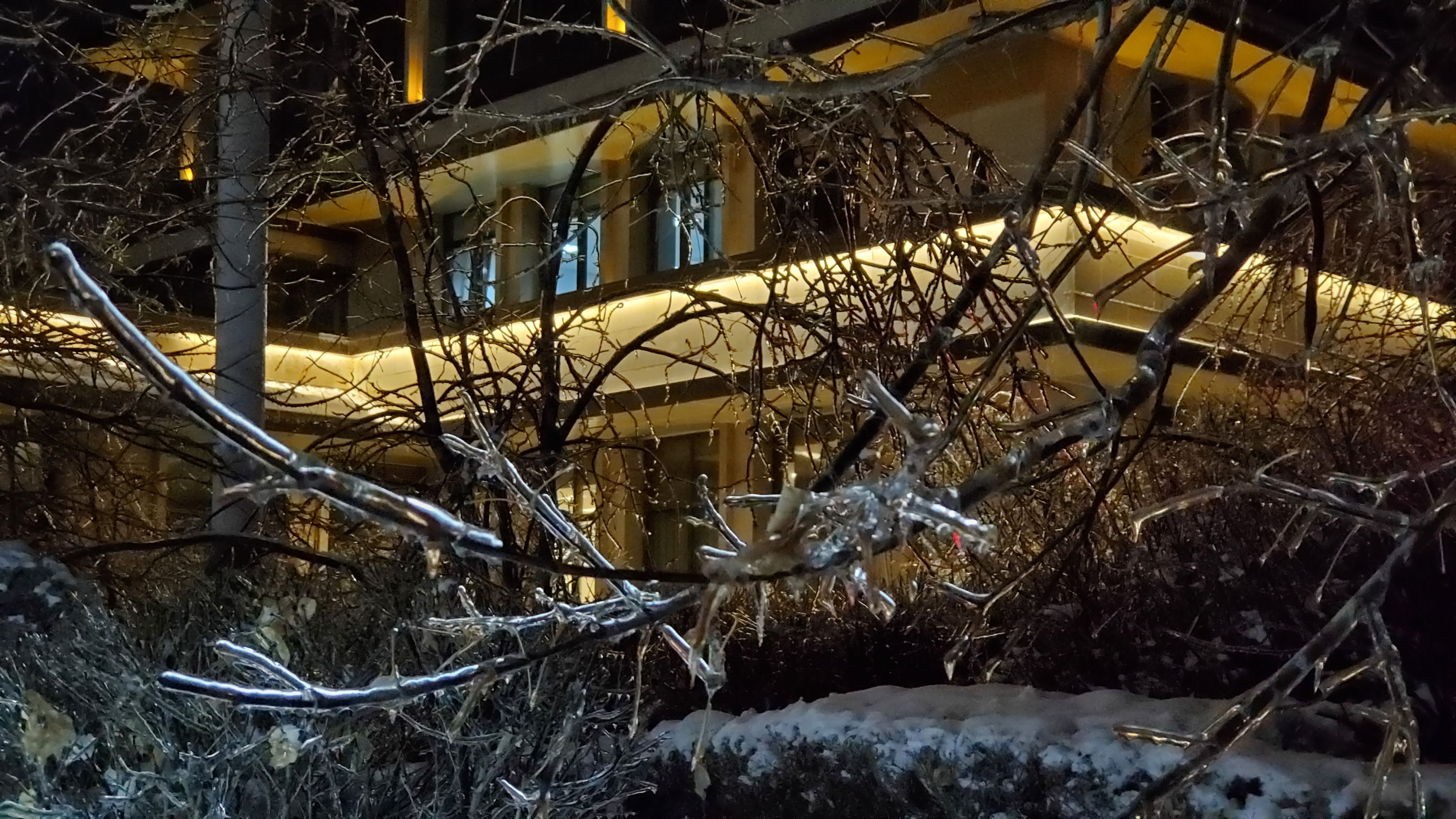 In the following film, you can hear the sound of the iced water in the trees. It sounded like breaking glass. / No seguinte vídeo, podemos ouvir o som dos galhos das árvores congelados, como se fosse vidro se quebrando.